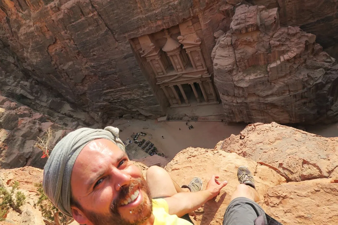 Pai na gestão de uma aventura inesquecível, contemplando a grandiosidade da antiga cidade de Petra do alto de um penhasco.