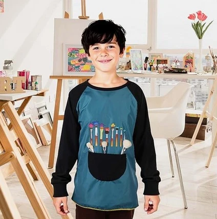 Este avental é igualmente impermeável, possui os elásticos nos punhos e de fácil utilização. Diferencia-se estéticamente pelas cores mais sóbreas e também pelos bolsos: dois níveis bem fixos ao colo da criança, facilitando o acesso aos utensílios. Idade recomendada: dos 3 aos 8 anos.